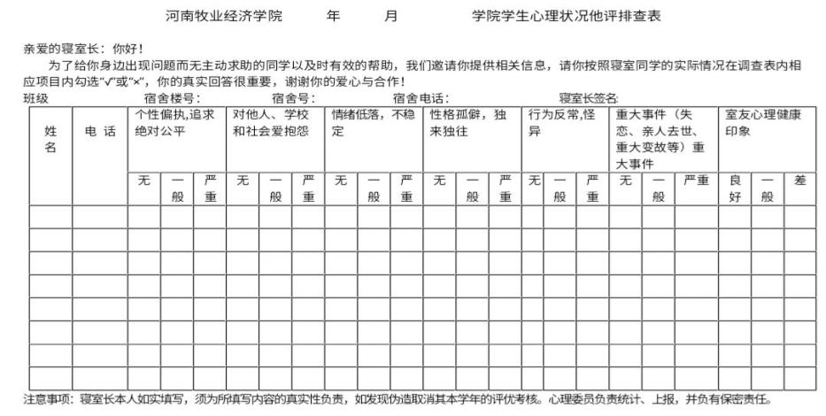 米乐官网心教部于2020年10月13日至2020年10月16日对17,18,19,20级学生进行本月的心理健康排查工作,寝室长以寝室为单位进行统计,随后心理委员进行汇总并将结果发给团学会心教部干事,由心教部负责人收集后进行筛选,最后发给所属辅导员。辅导员根据具体情况对有心理问题的同学进行进一步谈话,深入了解指导。