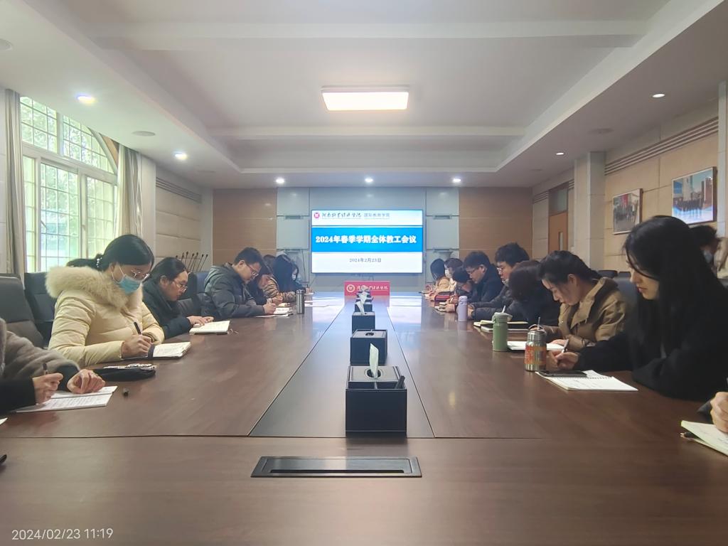 院长胡晓波传达了学校春季学期中层干部会议精神,详细解读了学校2024年党政工作要点,并对新学期学院工作提出了要求和希望。他指出,2024年是中华人民共和国成立75周年,是实现学校“十四五”规划目标任务的关键之年,也是推动学院高质量内涵式发展的攻坚之年;2024年全院上下要以“解放思想求创新、攻坚克难求突破”为工作主基调,全面落实立德树人根本任务,紧紧围绕学校发展战略,切实将思想和行动统一到学校党委决策部署上来,坚定不移以高质量党建引领推动学院各项事业高质量发展。他就做好2024年学院重点工作进行了强调。一是坚持党建统领。要持续完善“第一议题”制度,提升学院党委理论学习中心组学习质效,切实用党的创新理论武装头脑、指导实践、推动工作;要构建“八横四纵”思想政治教育体系,丰富日常党员教育、学生干部培训、党课团课的内容和形式,确保学习走深走实更走心;要实施“两化一创”行动,夯实基层党支部建设根基,形成大抓基层、大抓支部的良好态势。二是优化项目管理。要以大外事、大教学思维推动 “三方联动、双院协同”工作机制良好运行;要聚焦“最后一公里”,提标准、抓规范、促提升,各项工作要做到系统思考、整体设计,切实以服务师生的实效作为检验一切工作的根本标准;要以“年报、评估、访学、游学”等工作为抓手,不断规范项目管理,促进项目提质增效。三是加强学生管理。要坚持以“一站式”学生社区建设为契机,结合学院办学特点,加强与专业学院在学生管理、思想政治教育等方面的交流,打造协同育人机制;要深入推进思想政治辅导员专业化发展计划和学生思想政治教育领航计划等“双计划”的认知和全面部署,提升思想政治教育成效;要以学情分析为基础,坚持在每一个阶段为每一位学生提供“最适合”的教育,下大力气抓好学风建设。