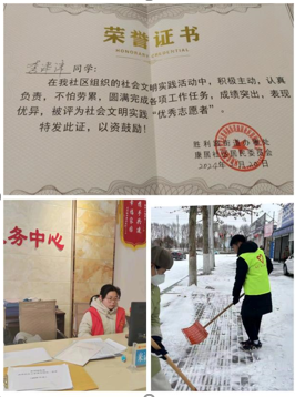 在社区服务中心,首先对社区情况进行简单了解,对社区中收集的就业人员相关档案进行归纳整理,又恰逢第五次经济普查,对社区被抽查的商户信息进行清查和整理;之后通过上门进行燃气安全隐患排查,提高居民对燃气使用的安全意识,防范火灾发生。在下大雪时,社区紧急安排扫雪除冰活动,利用好配发的扫雪工具,盐水等物资,为居民开辟出一条“平安路”。并在活动获得优秀志愿者称号。