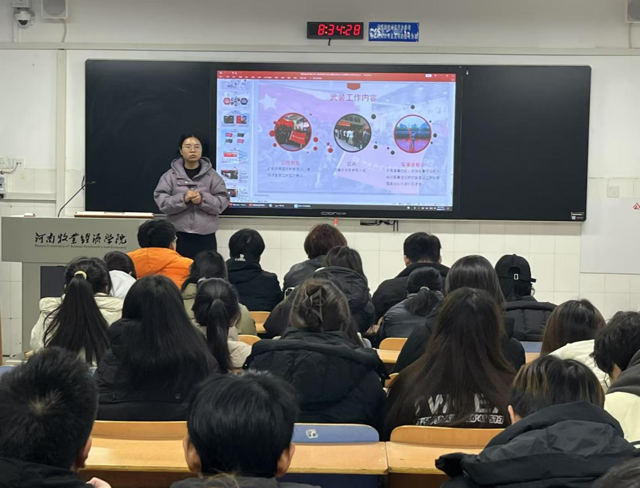 会上,辅导员首先通过三个军事宣传片向同学们展示了我国军队的现代化建设与发展,激发了大家的爱国情怀,并让同学们更加直观地了解了军人的责任与荣光。接着,辅导员从参军入伍报名条件、入伍流程、服役期间享受津贴、学费补偿代偿等方面详细讲解了征兵工作的整体流程以及相关政策,使同学们对征兵工作有了全面的了解。最后,辅导员就同学们提出的一些常见问题进行了详细解答,帮助他们对参军入伍有了更清晰的认识。